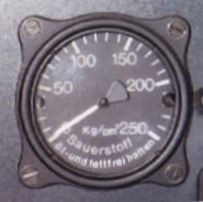 The oxygen ("Sauerstoff") pressure gauge as installed in the FW190A8. The dial measured from 0 to 250 kg/cm² and indicated that the system should be kept free of oil and grease ("öl- und fettfrei halten").
